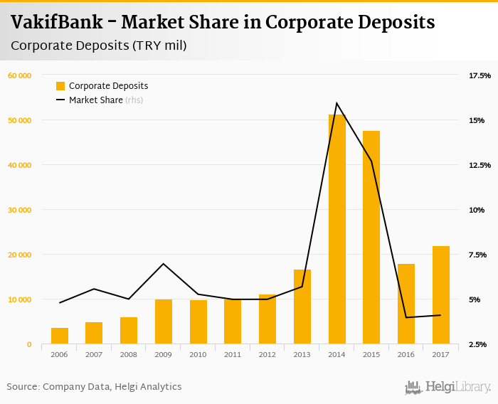 VakifBank accounted for 4.08% of all corporate deposits taken by banks in Turkey at the end of 2017. Historically, the bank’s market share in corporate deposits reached an all time high of 15.9% in 2014 and an all time low of 3.95% in 2016.