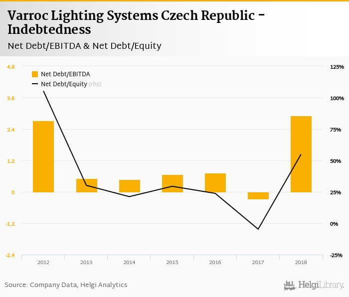 Varroc Lighting Systems Czech Republic's net debt stood at CZK 2,121 mil and accounted for 55.0% of equity at the end of 2018. The ratio is up 59.7 pp compared to the previous year.