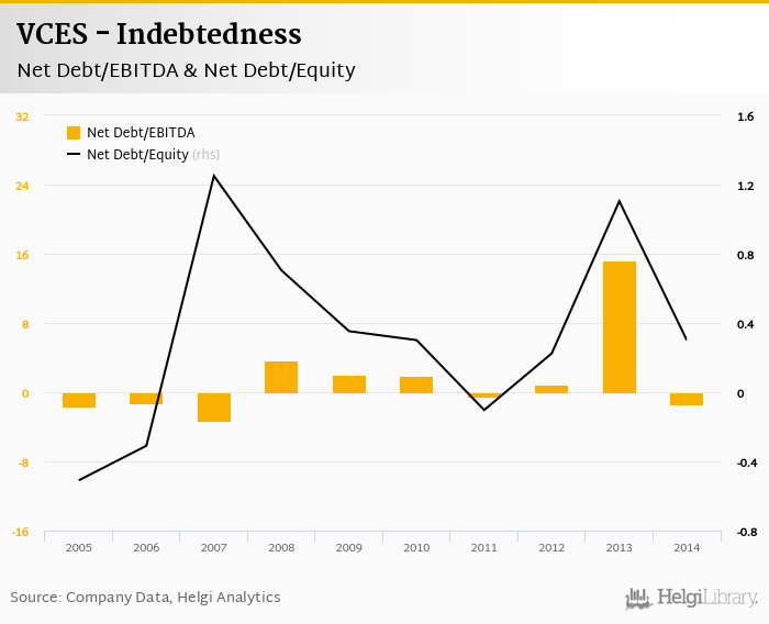 VCES's net debt stood at CZK 68.4 mil and accounted for 0.300 of equity at the end of 2014. The ratio is down 0.804 pp compared to the previous year.