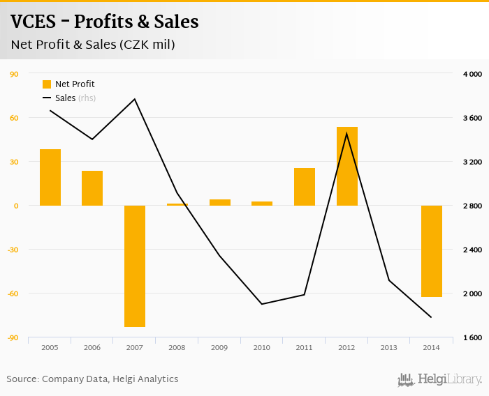 VCES made a net profit of CZK -62.4 mil in 2014, down 47% compared to the previous year. Total sales reached CZK 1,775 mil, which is down 16% when compared to the previous year.
