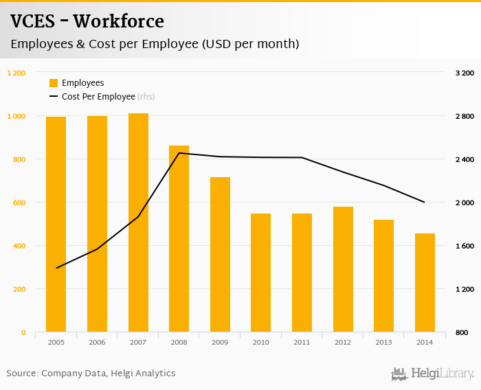 VCES employed 458 employees in 2014, down 12.1% compared to the previous year. Historically, between 2004 and 2014, the firm's workforce hit a high of 1,020 employees in 2004 and a low of 458 employees in 2014.