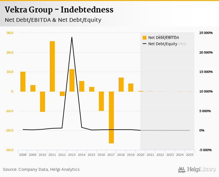 Vekra Group's net debt stood at CZK 30.0 mil and accounted for 7.50% of equity at the end of 2020. The ratio is down 188 pp compared to the previous year.