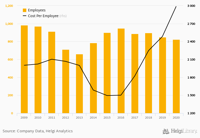 Vekra Group employed 823 employees in 2020, down 2.95% compared to the previous year. Historically, between 2009 and 2020, the firm's workforce hit a high of 984 employees in 2009 and a low of 662 employees in 2013.