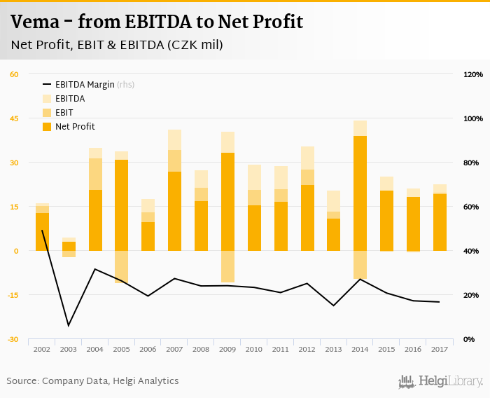 Vema made a net profit of CZK 19.3 mil with revenues of CZK 137 mil in 2017, up by 5.54% and up by 11.9%, respectively, compared to the previous year. This translates into a net margin of 14.1%.