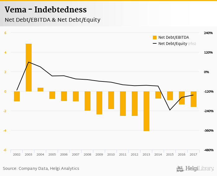 Vema's net debt stood at CZK -35.8 mil and accounted for -144% of equity at the end of 2017. The ratio is up 14.8 pp compared to the previous year.