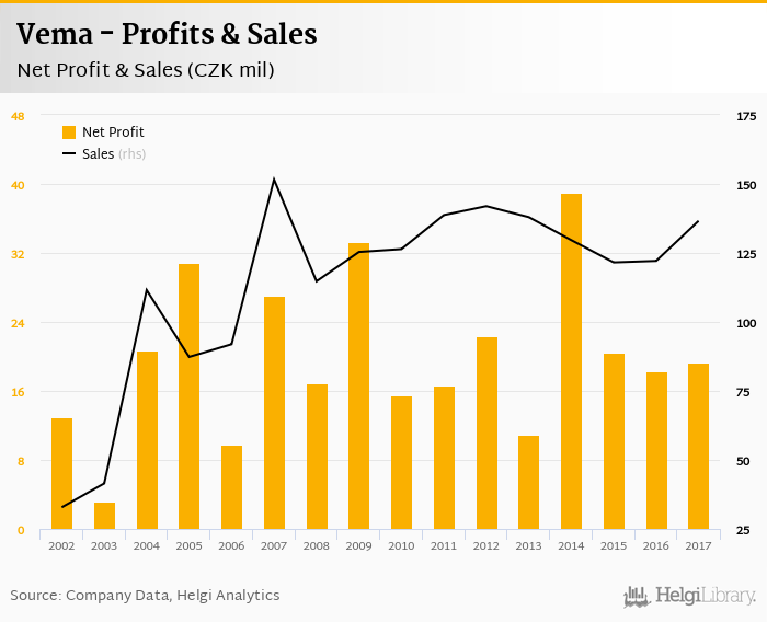 Vema made a net profit of CZK 19.3 mil in 2017, up 5.54% compared to the previous year. Total sales reached CZK 137 mil, which is up 11.9% when compared to the previous year.