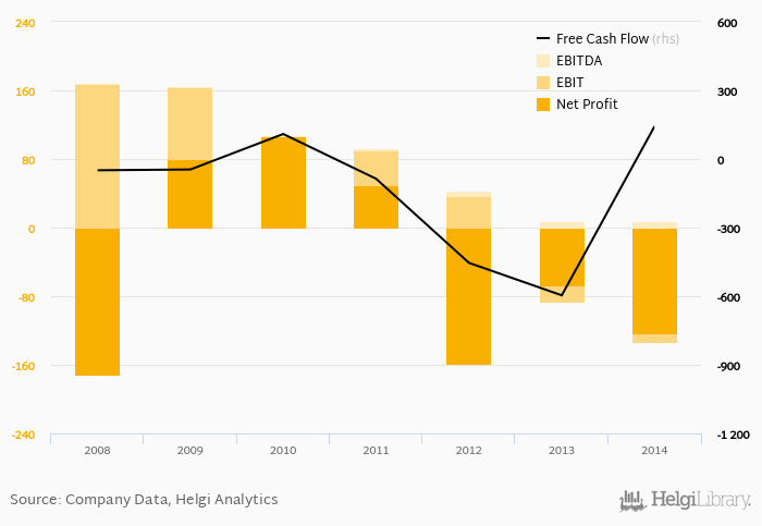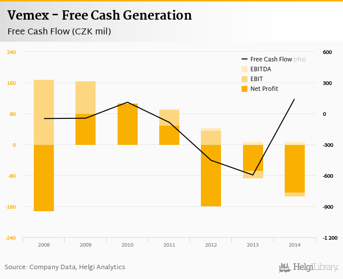 The company generated cash, defined by a sum of net profit and depreciation, of CZK -116 mil or -1.08% of sales. When investments are excluded, free cash flow reached CZK 143 mil, or 1.33% of sales in 2014.