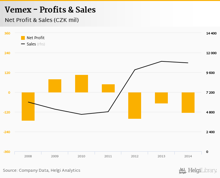 Vemex made a net profit of CZK -124 mil in 2014, down 84.3% compared to the previous year. Total sales reached CZK 10,758 mil, which is down 1.7% when compared to the previous year.