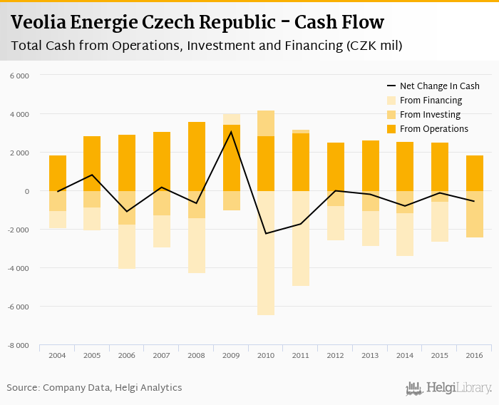 Cash from financing amounted to CZK 11.6 mil, so the company generated CZK -570 mil net cash in 2016.