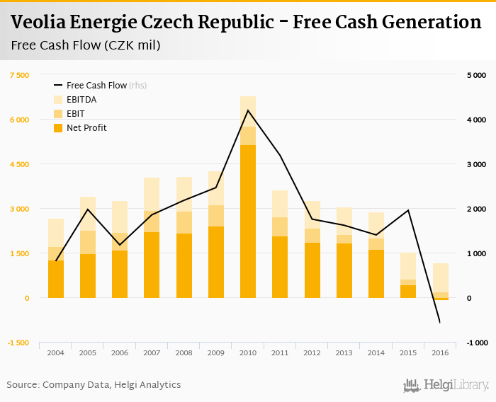 The company generated cash, defined by a sum of net profit and depreciation, of CZK -158 mil or -1.40% of sales. When investments are excluded, free cash flow reached CZK -582 mil, or -5.17% of sales in 2016.