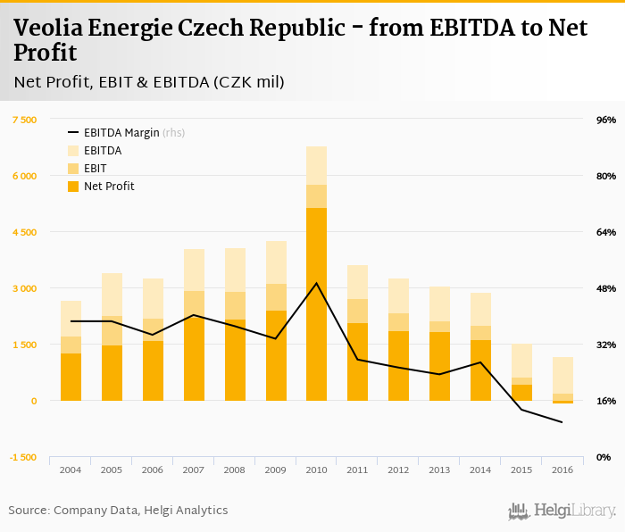 Veolia Energie Czech Republic made a net profit of CZK -79.0 mil with revenues of CZK 11,251 mil in 2016, down by 118% and down by 2.36%, respectively, compared to the previous year. This translates into a net margin of -0.702%.