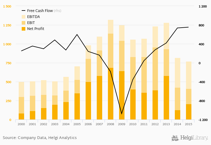 The company generated cash, defined by a sum of net profit and depreciation, of EUR 568 mil or 19.1% of sales. When investments are excluded, free cash flow reached EUR 753 mil, or 25.3% of sales in 2015.