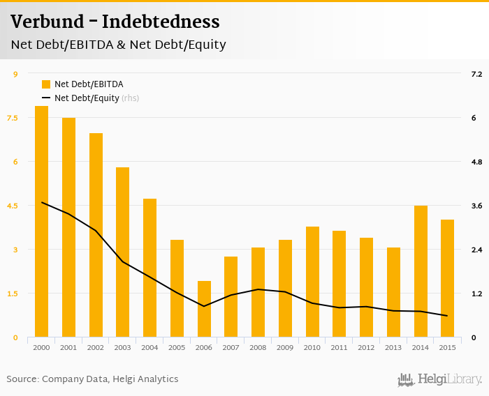 Verbund's net debt stood at EUR 3,101 mil and accounted for ... 0.571 of equity at the end of 2015. The ratio is down 0.123 pp compared to the previous year.