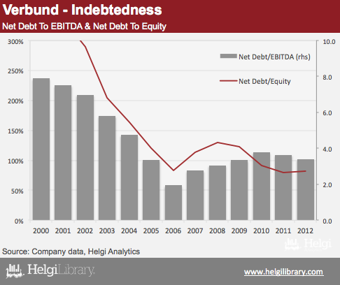 Thanks to its impressive profitability (ROE exceeded 20% in 2005-2009), Verbund's indebtedness dropped significantly in the last decade. Net debt reached 82% of Company's equity at the end of 2012, down from 205% in 2003