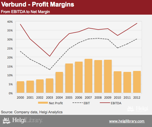 Despite increasing its installed capacity by more than 28% since 2006, Verbund's sales have increased by only about 10% while net profit is down more than 22% when compared to the 2012 numbers. As a result, Company's ROE has dropped from more the 20's in 2005-2009 to the single digits in he last two years.