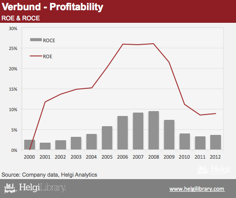 Despite increasing its installed capacity by more than 28% since 2006, Verbund's sales have increased by only about 10% while net profit is down more than 22% when compared to the 2012 numbers. As a result, Company's ROE has dropped from more the 20's in 2005-2009 to the single digits in he last two years.