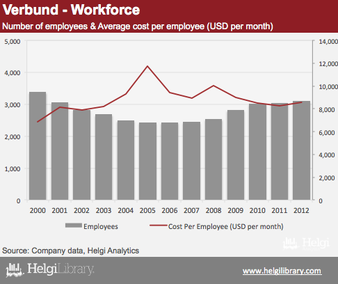 In 2012, the Company had 3,100 employees, nearly 16% more than a decade ago. At the same time, average staff cost has risen by only 4.8% since 2003 to USD 8,591 per employee
