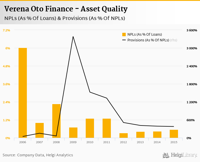 Verena Oto Finance's non-performing loans reached 0.550% of total loans at the end of 2015, up from 0.438% compared to the previous year. Historically, the NPL ratio hit an all time high of 6.03% in 2006 and an all time low of 0.315% in 2012.