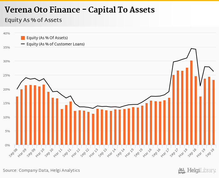 Verena Oto Finance's Equity reached 23.3% of total assets in the 3Q2019, down from 24.7% for the previous year. As a share of net customer loans, the ratio amounted to 26.2% at the end of the third quarter of 2019.