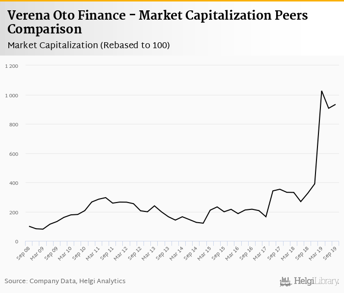 Verena Oto Finance stock traded at IDR 124 per share at the end of third quarter of 2019 implying a market capitalization of USD 49.7 mil.