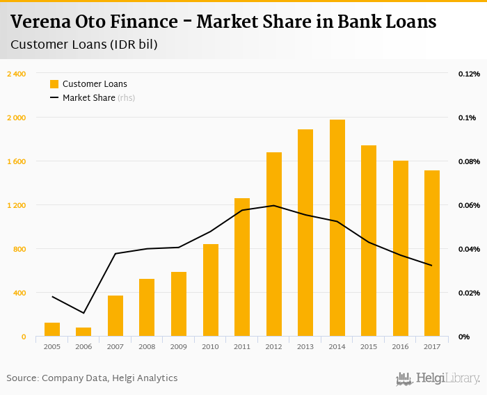 Verena Oto Finance accounted for 0.032% of all customer loans issued in Indonesia at the end of 2017. Historically, the bank’s market share in customer loans reached an all time high of 0.059% in 2012 and an all time low of 0.010% in 2006.