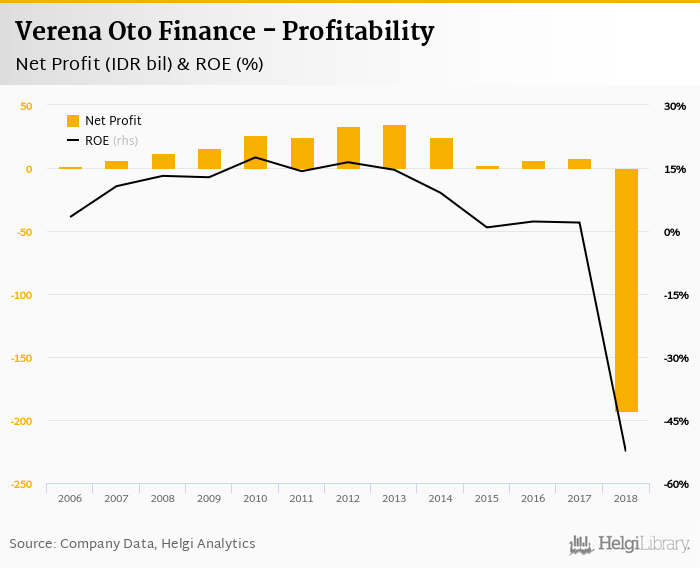 Verena Oto Finance made a net profit of IDR -193 bil in 2018, down 2,656% compared to the previous year. This implies a return on equity of -52.5%.