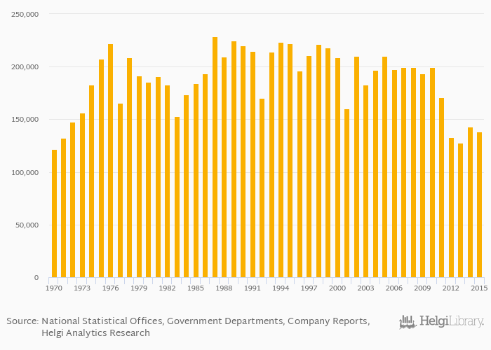 Historically, vermiculite production in South Korea reached an all time high of 228,863 tonnes in 1987 and an all time low of 121,896 tonnes in 1970.