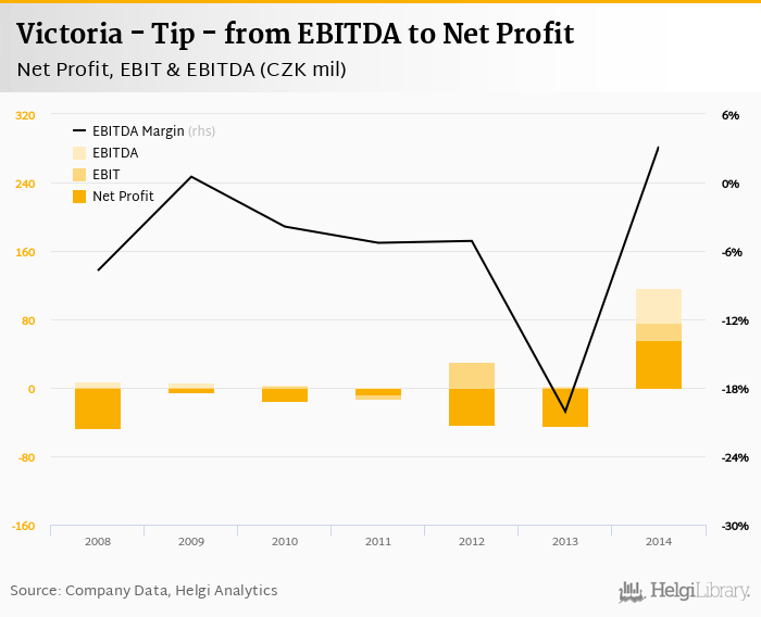 Victoria - Tip made a net profit of CZK 55.7 mil with revenues of CZK 3,703 mil in 2014, up by 227% and up by 1%, respectively, compared to the previous year. This translates into a net margin of 1.50%.