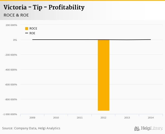 As far as Victoria - Tip's peers are concerned, Fortuna Entertainment Group generated ROE of 56.0% and ROCE of 28.4% in 2014. Synot Tip's profitability reached 7.51% and 2.41%, respectively. European Data Project operated with 17.6% and 39.3% returns in 2014.