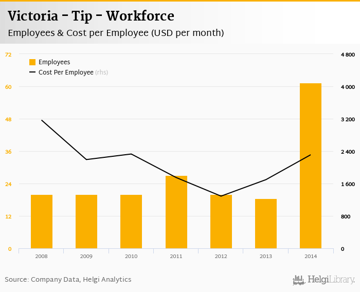 Victoria - Tip employed 61.3 employees in 2014, up 231% compared to the previous year. Historically, between 2008 and 2014, the firm's workforce hit a high of 61.3 employees in 2014 and a low of 18.6 employees in 2013.