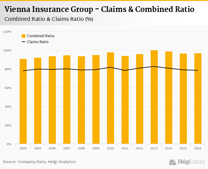Gross claims reached EUR 6,753 mil in 2016, so average claims ratio amounted to 78.3% in 2016. That is compared to an average 80.1% seen in the last five years.
