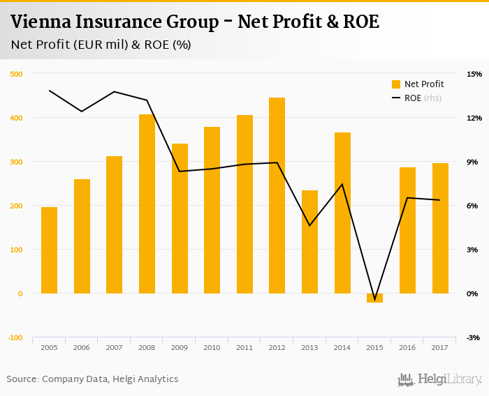 Vienna Insurance Group made a net profit of EUR 298 mil in 2017, up 3.41% when compared to the last year. This implies a return on equity of 6.33%.