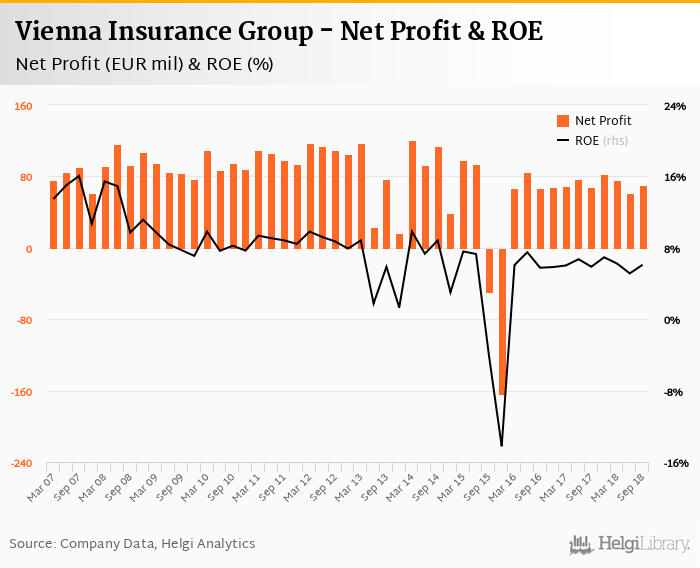 Vienna Insurance Group made a net profit of EUR 70.3 mil in 2018-09-30, up 15.0% when compared to the last year. This implies a return on equity of 6.10%.