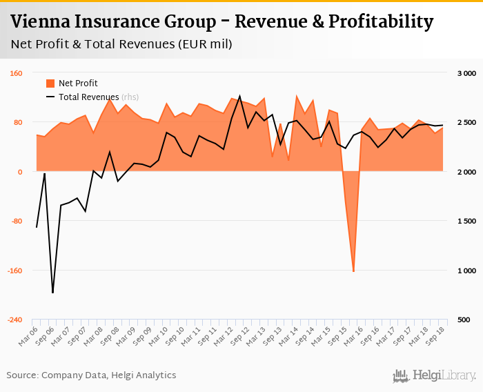 Vienna Insurance Group made a net profit of EUR 70.3 mil under revenues of EUR 2,465 mil in 2018-09-30, up 15% and up 0.282% respectively when compared to the last year.