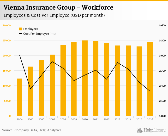 Vienna Insurance Group employed 24,601 persons in 2016, up 6.98% when compared to the previous year. Historically, the firm's workforce hit an all time high of 25,006 persons in 2010 and an all time low of 12,347 in 2004.
