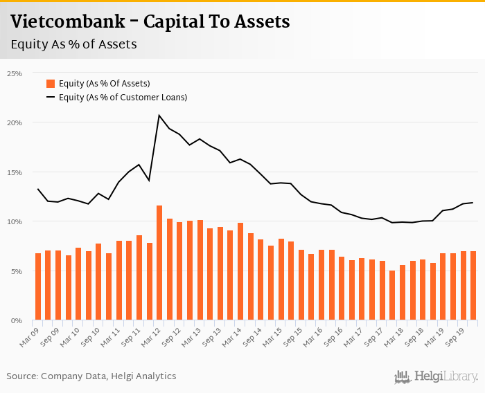 Vietcombank's Equity reached 7.01% of total assets in the 4Q2019, up from 5.79% for the previous year. As a share of net customer loans, the ratio amounted to 11.8% at the end of the fourth quarter of 2019.