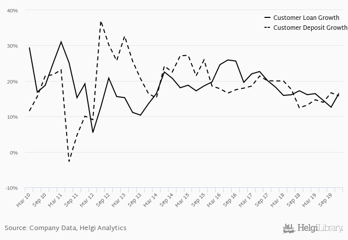 On the other hand, bank's customer deposit growth amounted to 15.8% at the end of 2019-12-31, up from 13.2% when compared to the previous year. Historically, the bank’s deposit growth reached an all time high of 37.0% in 2012-06-30 and an all time low of -2.74% in 2011-06-30. In the last decade, the average annual loan growth amounted to 0%.