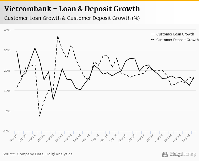 Vietcombank's customer loan growth reached 16.5% in 2019-12-31, up from 16.1% compared to the previous year. Historically, the bank’s loans growth reached an all time high of 31.0% in 2011-03-31 and an all time low of 5.44% in 2012-03-31. In the last decade, the average annual loan growth amounted to 0%.