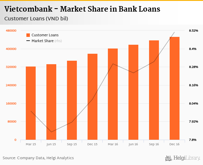 Vietcombank's customer loans reached VND 452,722 bil in 2016-12-31, up 3.37% compared to the previous year.