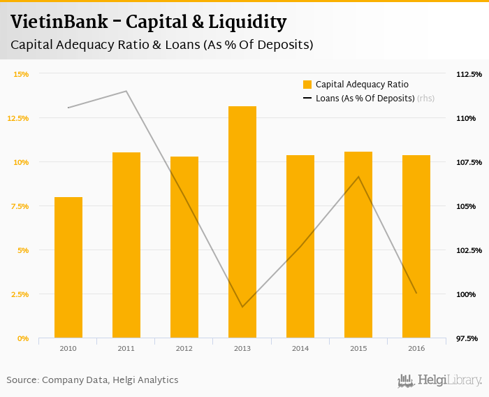 VietinBank's capital adequacy ratio reached 10.4% at the end of 2016, down from 10.6% compared to the previous year. Historically, the bank’s capital ratio hit an all time high of 13.2% in 2013 and an all time low of 8.02% in 2010.
