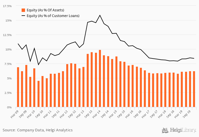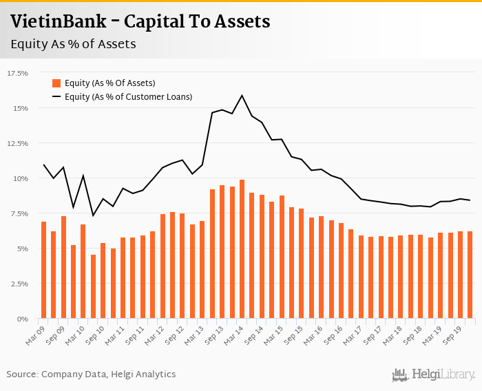 VietinBank's Equity reached 6.23% of total assets in the 4Q2019, up from 5.79% for the previous year. As a share of net customer loans, the ratio amounted to 8.39% at the end of the fourth quarter of 2019.