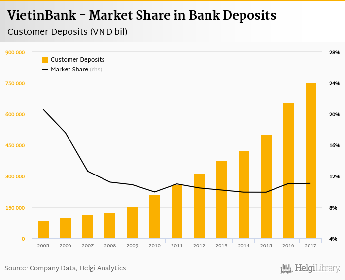 VietinBank accounted for 11.1% of all customer deposits taken by banks in Vietnam at the end of 2017. Historically, the bank’s market share in customer deposits reached an all time high of 20.6% in 2005 and an all time low of 9.91% in 2015.