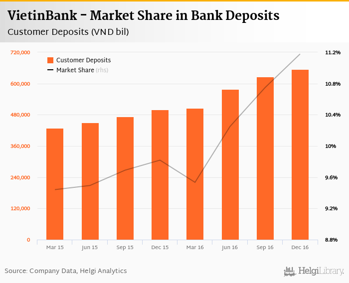 VietinBank accounted for 11.2% of all customer deposits taken by banks in Vietnam at the end of 2016-12-31. Historically, the bank’s market share in customer deposits reached an all time high of 11.2% in 2016-12-31 and an all time low of 9.44% in 2015-03-31.