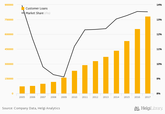 VietinBank accounted for 13.5% of all customer loans issued in Vietnam at the end of 2017. Historically, the bank’s market share in customer loans reached an all time high of 14.0% in 2005 and an all time low of 9.12% in 2009.