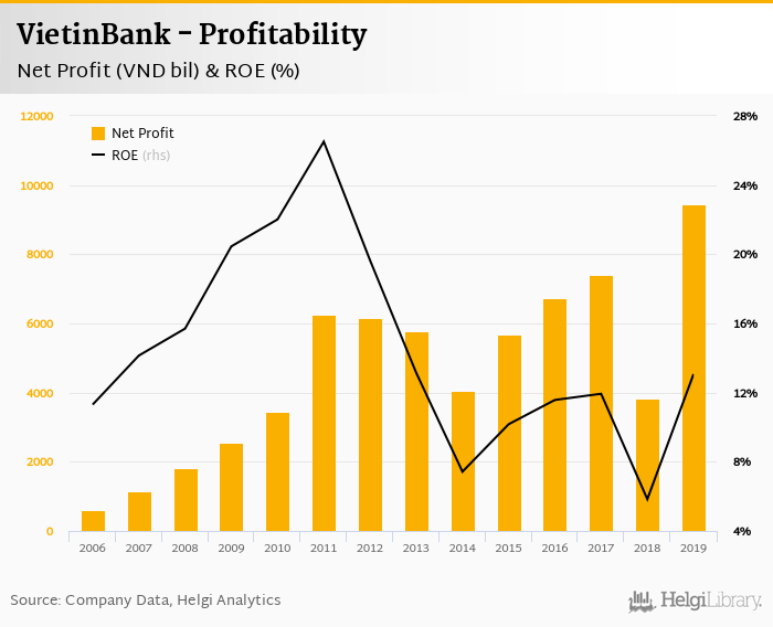 VietinBank made a net profit of VND 9,461 bil in 2019, up 147% compared to the previous year. This implies a return on equity of 13.1%.