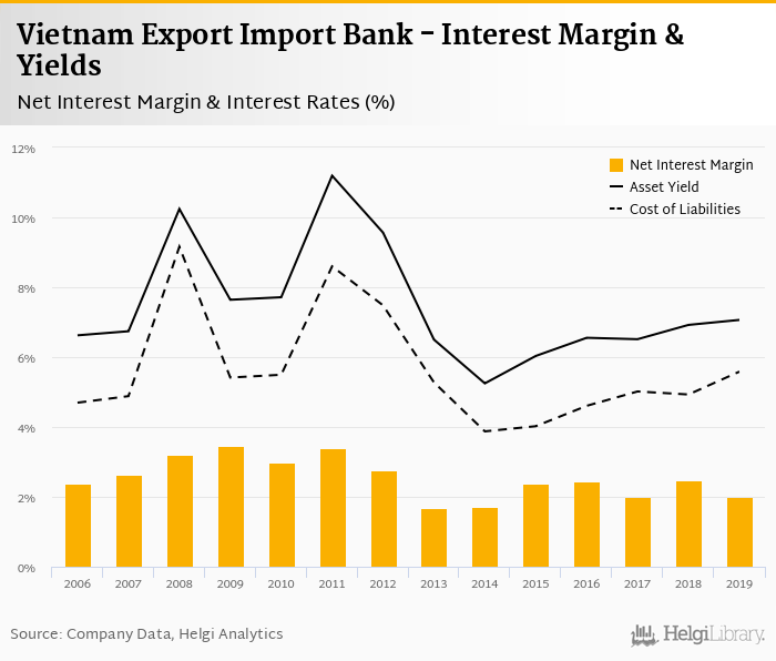 Vietnam Export Import Bank's net interest margin amounted to 2.01% in 2019, down from 2.47% compared to the previous year.