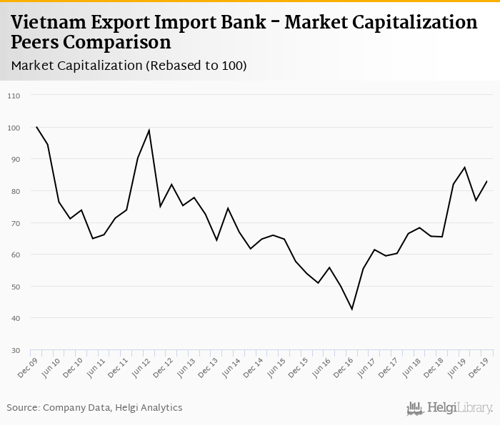Vietnam Export Import Bank stock traded at VND 17,800 per share at the end of fourth quarter of 2019 implying a market capitalization of USD 944 mil.