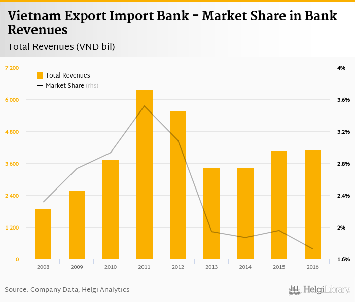 As a result, Vietnam Export Import Bank accounted for 1.73% of all bank revenues generated by banks in Vietnam in 2016. Historically, the bank’s market share in total revenues reached an all time high of 3.52% in 2011 and an all time low of 1.73% in 2016.