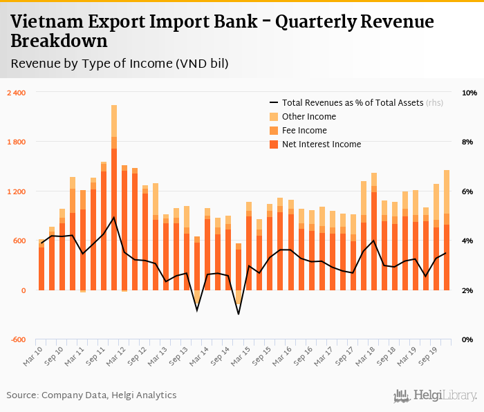 Vietnam Export Import Bank generated total banking revenues of VND 1,458 bil in the fourth quarter of 2019, up 21.4% when compared to the same period of last year and 12.9% when compared to the previous quarter.