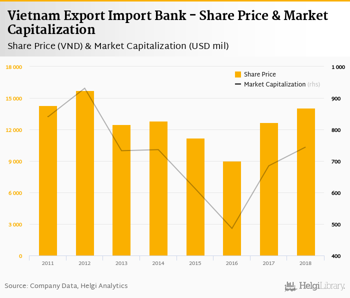 Vietnam Export Import Bank stock traded at VND 14,050 per share at the end of 2018 implying a market capitalization of USD 744 mil.